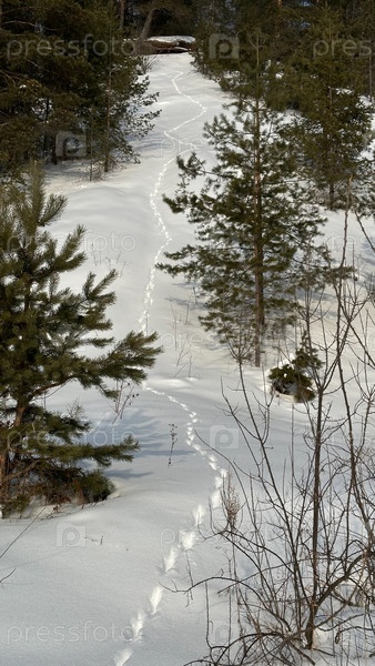 Следы дикого зверя на снегу в лесу в зимний солнечный день