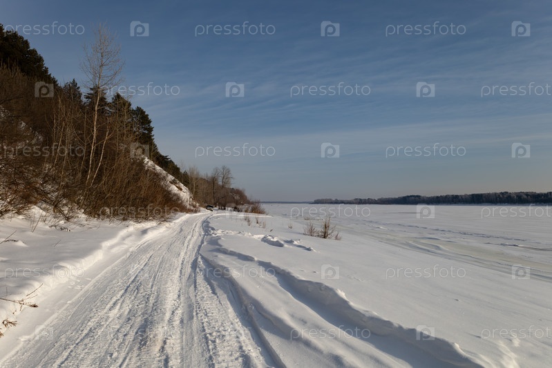 Река Кама покрыта льдом и снегом в солнечный зимний морозный день