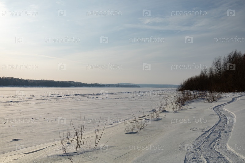 Река Кама покрыта льдом и снегом в солнечный зимний морозный день
