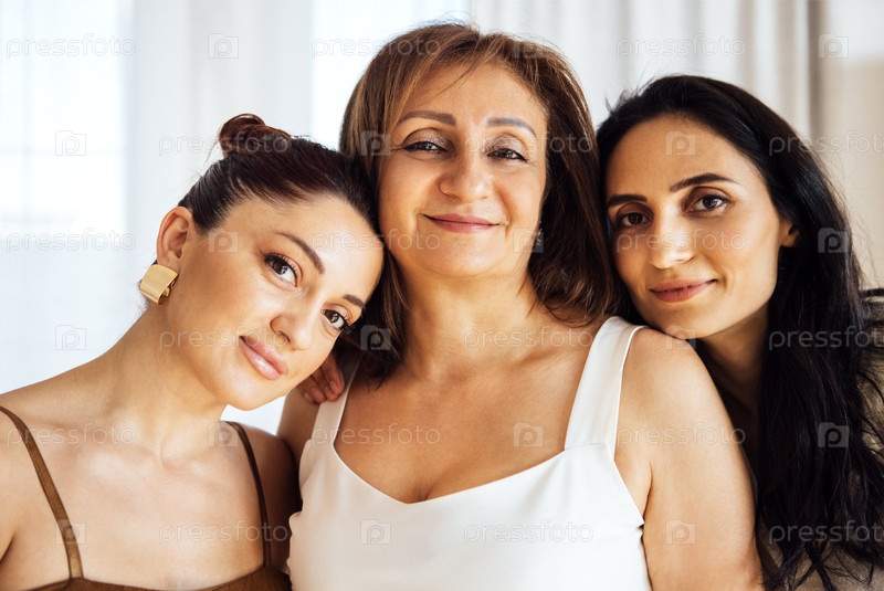 Три женщины ближневосточного происхождения, улыбающиеся вместе в яркой внутренней среде, демонстрируя теплоту, связь и семейные узы в радостной атмосфере