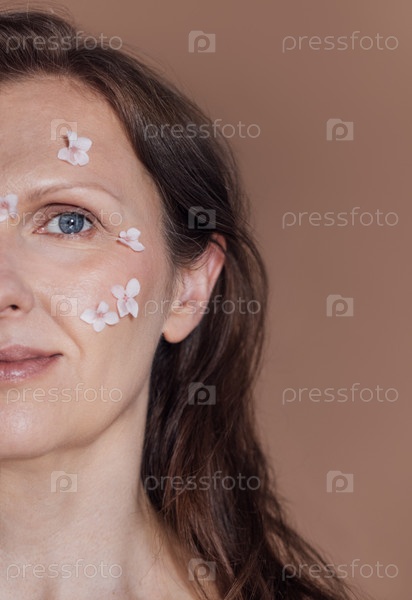 Женщина с длинными коричневыми волосами, украшенная тонкими розовыми цветочными лепестками на лице, демонстрирует естественную красоту и уход за кожей в мягкой теплой обстановке