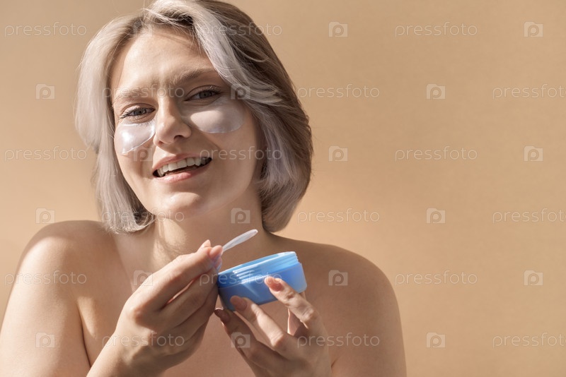 Улыбающаяся женщина с короткими светлыми волосами, средствами по уходу за кожей, носящая пятна под глазами, в спокойной обстановке, демонстрируя рутину самообслуживания и красоты для исцеления и расслабления