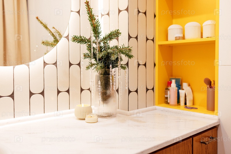 Современный интерьер ванной комнаты со стильной столешницей с вазой из зелени, свечей и косметических продуктов, дополненная геометрическими плитками и ярко-желтыми акцентами