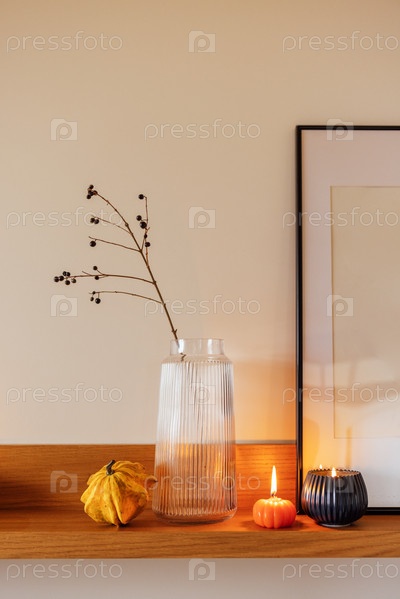Декоративное расположение полки с прозрачной стеклянной вазой с ветвями, желтой тыкву, небольшую оранжевую и зажженную свечу, создавая уютную осеннюю атмосферу
