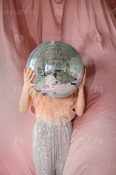 Молодая девушка в ржавом томе и блестящих брюках держит большой дискотечный шар, окруженный мягкой розовой тканью перед лицом, создавая странную и игривую атмосферу