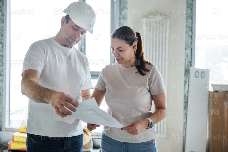 Мужчина и женщина обсуждают строительные планы в яркой незавершенной комнате, окруженной инструментами и материалами, демонстрируя сотрудничество и взаимодействие в проекте реконструкции
