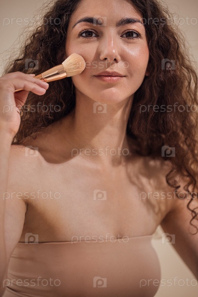 Женщина с кудрявыми волосами, наносящая макияж на щеку кистью, демонстрируя рутину красоты и заботясь о себе в минималистической обстановке с мягким освещением и естественными тонами