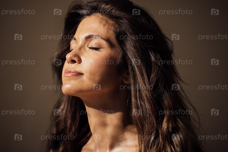 Женщина с длинными темными волосами, закрытые глаза, наслаждающаяся солнечным светом на лице, демонстрируя безмятежное выражение лица, подчеркивая красоту и спокойствие в мягкой теплой атмосфере
