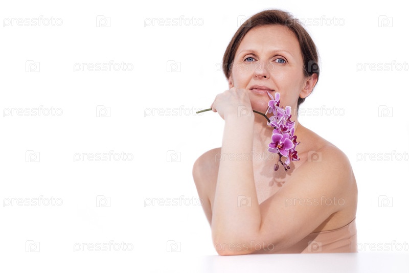 Женщина с короткими волосами, держащая фиолетовый цветок орхидеи рядом со своим лицом, тоскуя смотрит вдаль, показывая красоту и спокойствие в минималистической обстановке с копировальным пространством