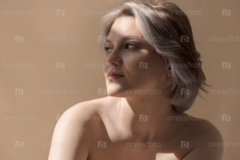 Портрет женщины с короткими серебристыми волосами, задумчиво глядящей в сторону, освещенной мягким естественным светом на теплом бежевом фоне, захватывающей спокойную красоту и самоанализ