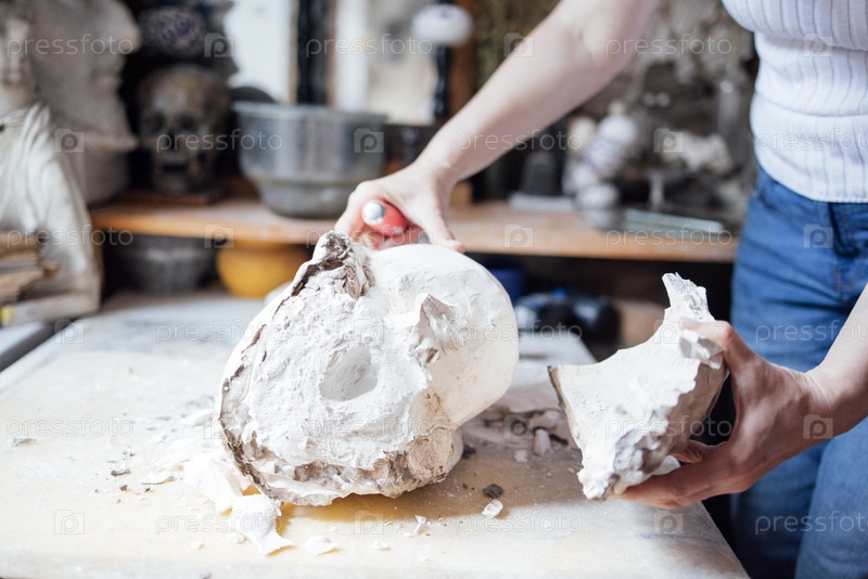 Художник тщательно изобразил гипсовую модель черепа в творческой студии, окруженной художественными инструментами и материалами, демонстрируя искусство создания скульптуры
