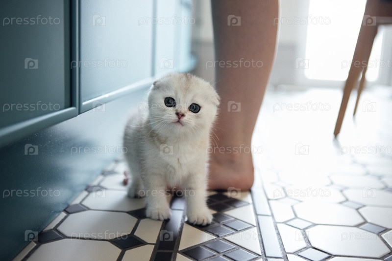 Очаровательный пушистый котенок с голубыми глазами стоит на рисунковом плиточном полу, любопытно глядя на мужскую ногу, создавая теплую и приятную домашнюю атмосферу