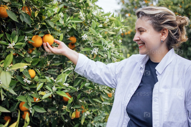 Женщина, собирающая спелые апельсины с дерева в саду, радостно улыбается вокруг пышных зеленых листьев и ярких фруктов, демонстрируя сельскохозяйственную работу и связь с природой