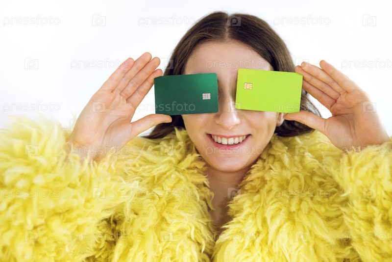 Молодая женщина с длинными волосами в ярко-желтом пушистом пальто держит зеленые и синие карточки на лице, демонстрируя игривую моду и творческое выражение