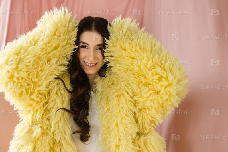 Молодая женщина с длинными темными волосами в пушистом желтом пальто ярко улыбается на мягком розовом фоне, демонстрируя яркую моду и радостное выражение лица в игривой атмосфере