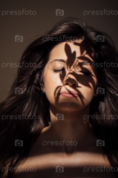 Молодая женщина с длинными темными волосами, закрытыми глазами, освещенная мягким светом, со сложными тенями на лице, создавая спокойную и созерцательную атмосферу в минималистической обстановке