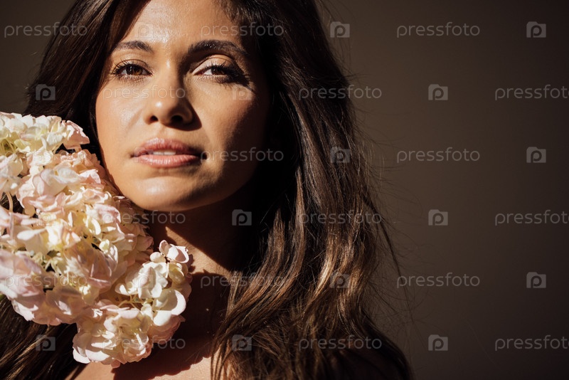 Женщина с длинными темными волосами держит нежные розовые цветы рядом со своим лицом, демонстрируя естественную красоту и элегантность на мягком нейтральном фоне, подчеркивая цветковую связь