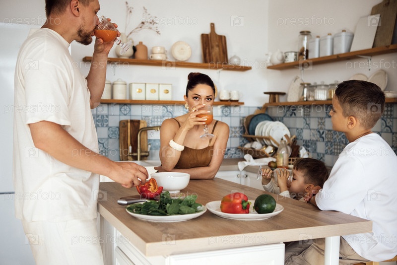 Семья наслаждается здоровыми напитками вместе в яркой кухне, окруженной свежими овощами и фруктами, создавая теплую и привлекательную атмосферу для общих моментов