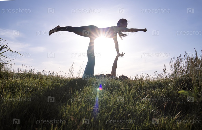 Силуэт женщины, выполняющей акробатические позы при поддержке женщины на травяном поле, с солнечным светом, создающим драматический фон и улучшающим динамическое движение