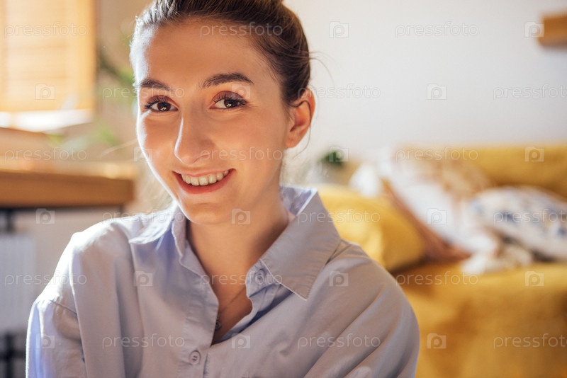 Портрет симпатичной девушки в синей рубашке на диване в гостиной