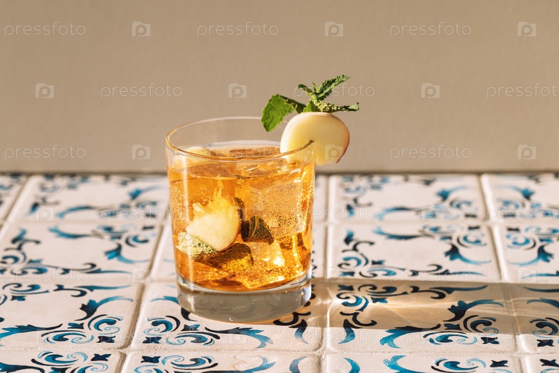 Близкий снимок бокала минеральной воды с персиком и свежей мятой на столе с рисунковыми плитками