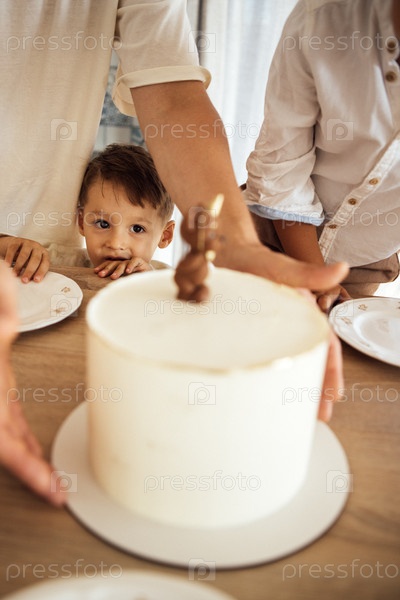 Мальчик с нетерпением ждет, когда взрослый человек положит на стол красиво украшенный торт в окружении членов семьи и создаст радостную атмосферу праздника