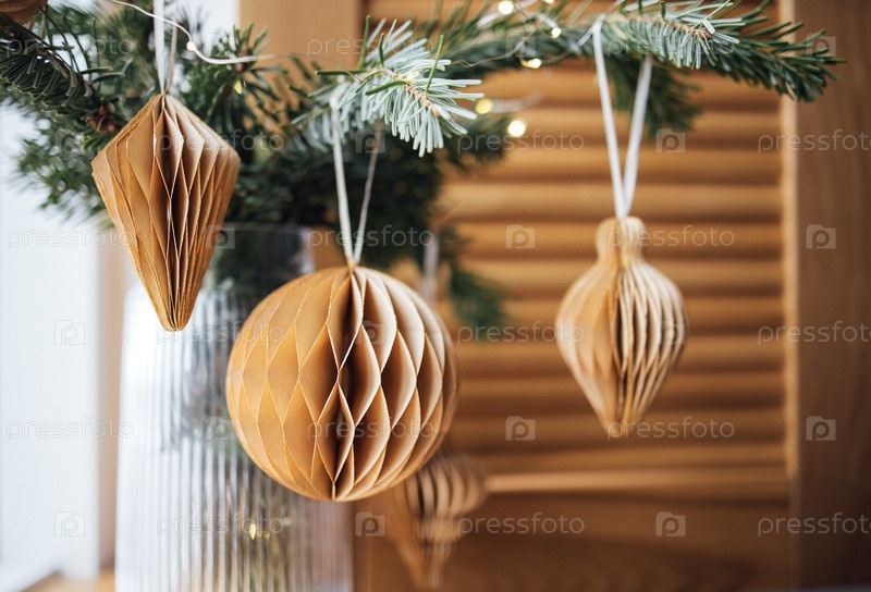 Декоративные клеточные бумажные украшения в теплых цветах, висящие на ветке сосны, создают уютную атмосферу праздника с деревянным фоном и мягким освещением