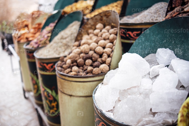 Красочное отображение различных специй и трав в традиционных контейнерах, показывающих разнообразные текстуры и формы, создавая яркую атмосферу рынка с богатым культурным значением