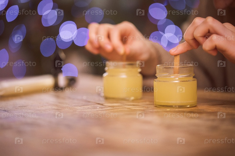 Руки мужчины тщательно перемешивают воск в стеклянных банках на деревянном столе с мягкими огнями боке на заднем плане, создавая уютную атмосферу ремесла