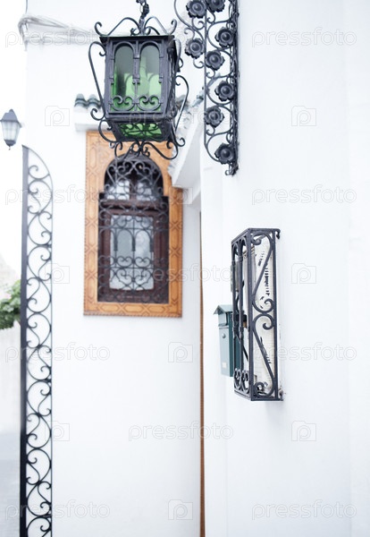 Элегантная уличная сцена с винтажным фонарем и декоративными деталями из кованого железа на чистой белой стене, демонстрирующей архитектурную красоту и очарование в спокойной обстановке