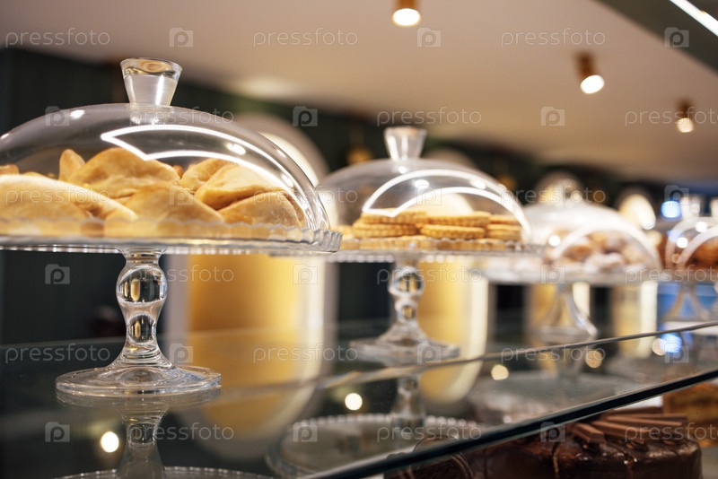 Экспозиция разнообразных хлебобулочных изделий под стеклянными куполами в современной пекарне, показывающая вкусные выпечки и печенье на стильной столешнице с теплым освещением