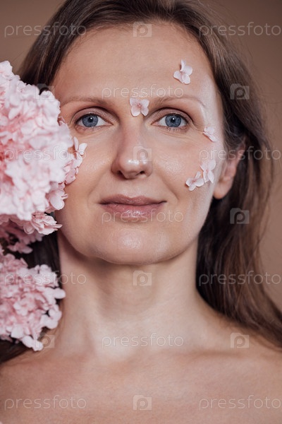 Женщина с длинными волосами, украшенные розовыми цветочными лепестками, уверенно смотрит в камеру, демонстрируя естественную красоту и спокойствие в мягкой теплой среде