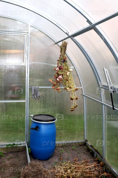 Букет сушеных астеров висит на потолке теплицы над бочкой воды в осенний день