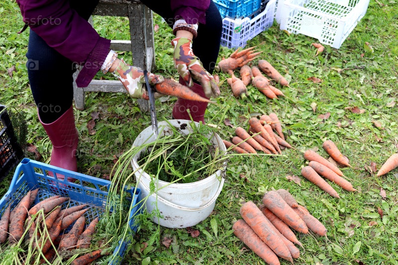Руки женщины в перчатках очищают морковь с земли через ведро