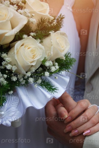 Свадьба. Близкий план невесты и жениха, держащихся за руки с букетом белых роз. Рука в руку