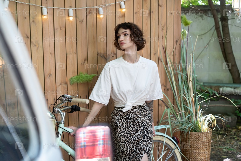 Красивая молодая женщина позирует на пикнике летом