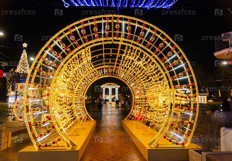 Новогодняя световая арка на улице в городе Ростов-на-Дону ночью