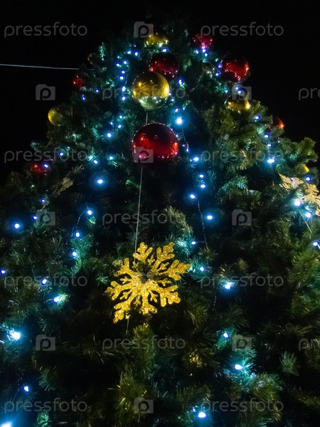 Рождественская елка с игрушками и гирляндой ночью