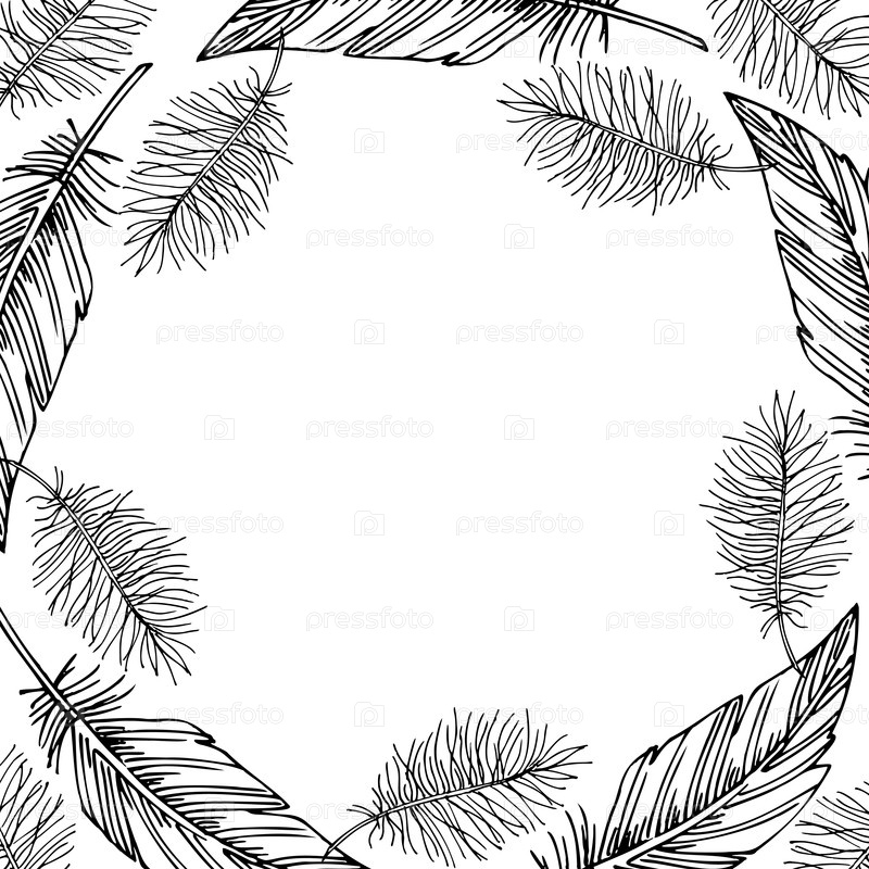 Квадратная рама из перьев и дна. Ручная иллюстрация в стиле векторного чернил. Для дизайна упаковки, карт, обложек, печатных работ, этикеток на продуктах и тканей