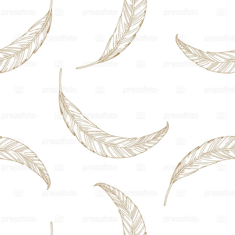 Бесшовный рисунок перьев в бежевом цвете. Ручная иллюстрация в стиле векторного чернила. Для дизайна упаковки, карт, обложек, печатных изображений, этикеток на продуктах и тканей