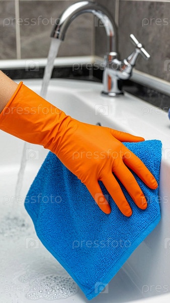 Рука в резиновой оранжевой перчатке крупный план с салфеткой из микроволокна.Чистка и мытье сантехники