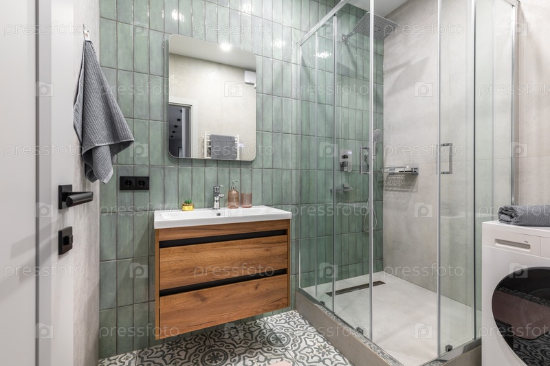 Стильный современный интерьер ванной комнаты с зелеными стеклянными плитками, деревянным тщеславием, стеклянной душевой каютой и рисунковым полом, создавая свежий минималистический вид