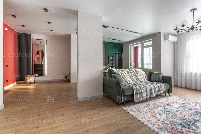 Просторная современная гостиная с зеленым диваном и открытой планировкой