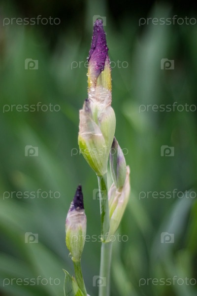 Портрет цветущего ириса, на котором изображен молодой бутовый цвет с каплями воды