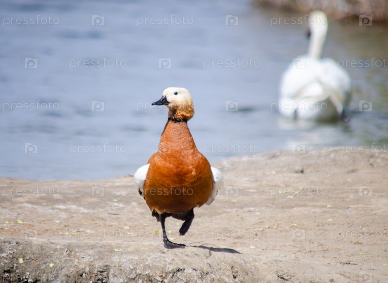 Утка-чар и лебедь на заднем плане