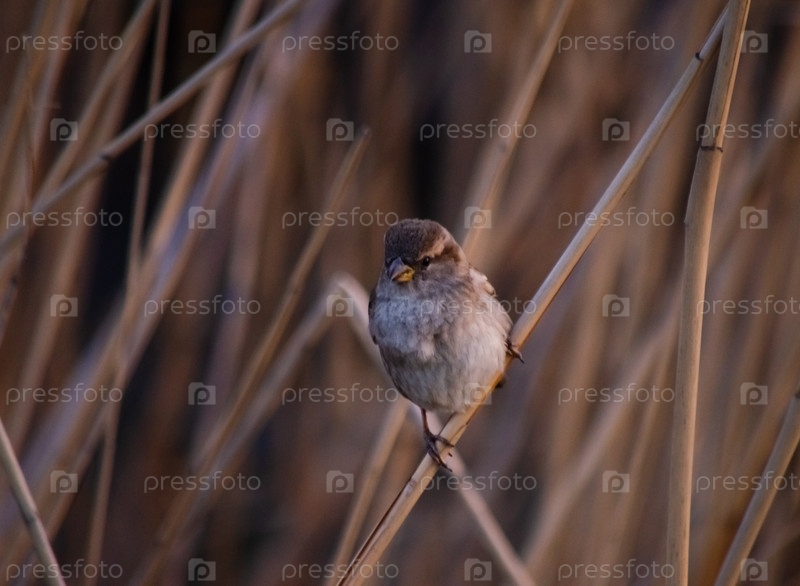 Воробей на сухих стеблях тростника. домашний воробь - самка