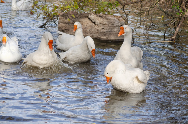Стадо домашних гусей на воде