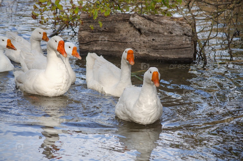 Стадо домашних гусей на воде