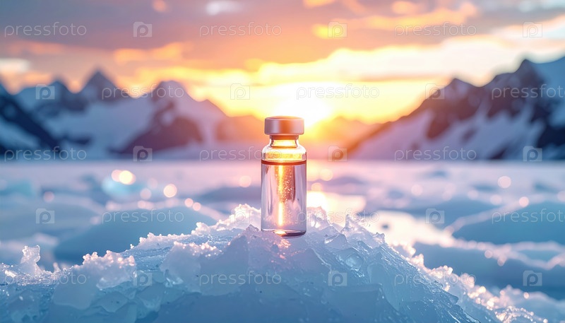 Стеклянная бутылка светит на ледяном ландшафте на рассвете, символизируя научные открытия и надежду, возникающие в самых холодных местах Земли