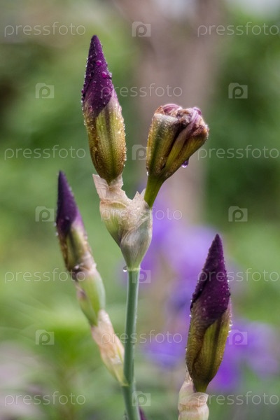 Портрет цветущего ириса, на котором изображен молодой бутовый цвет с каплями воды